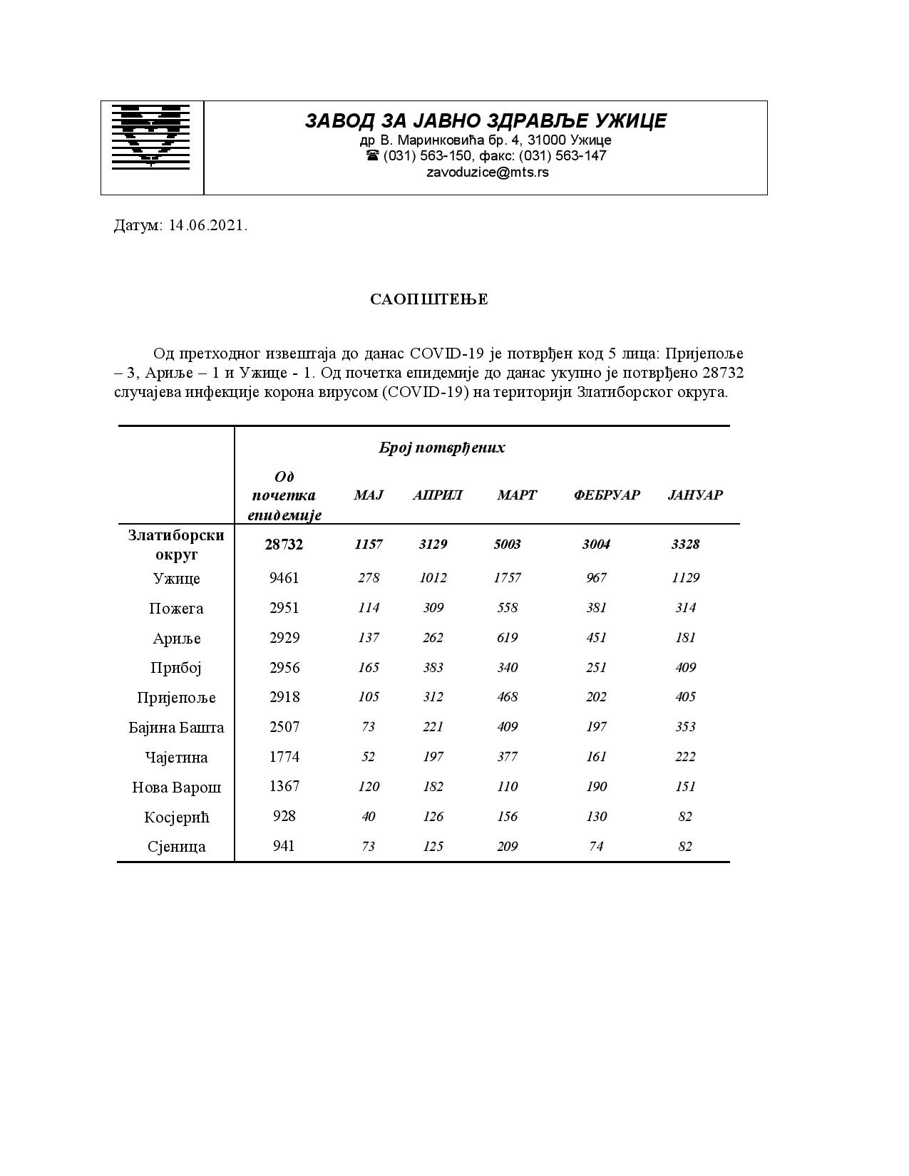 – 3, Ариље – 1 и Ужице – 1. Од почетка епидемије до данас укупно је потврђено 28732