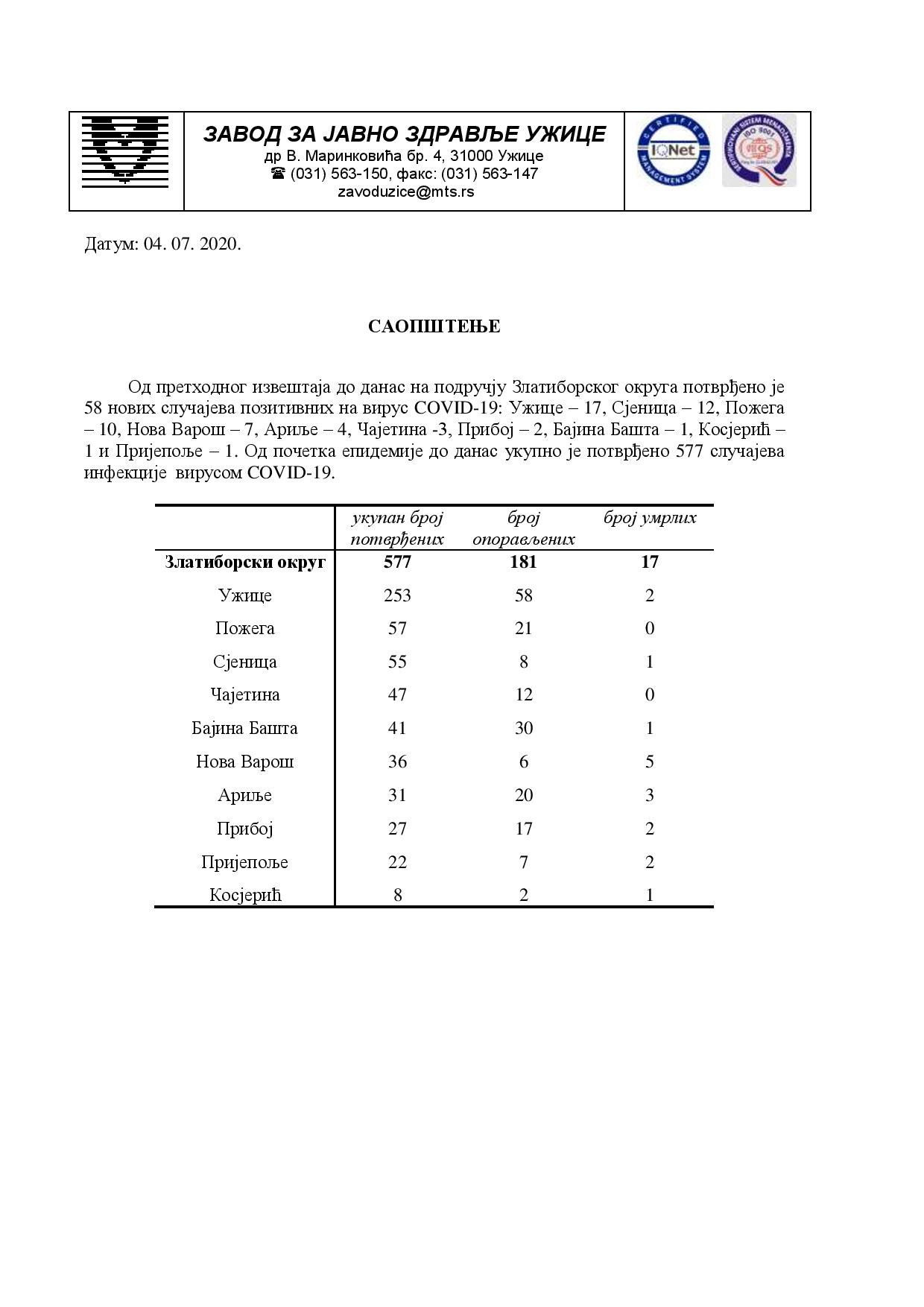 1 и Пријепоље – 1. Од почетка епидемије до данас укупно је потврђено 577 случајева