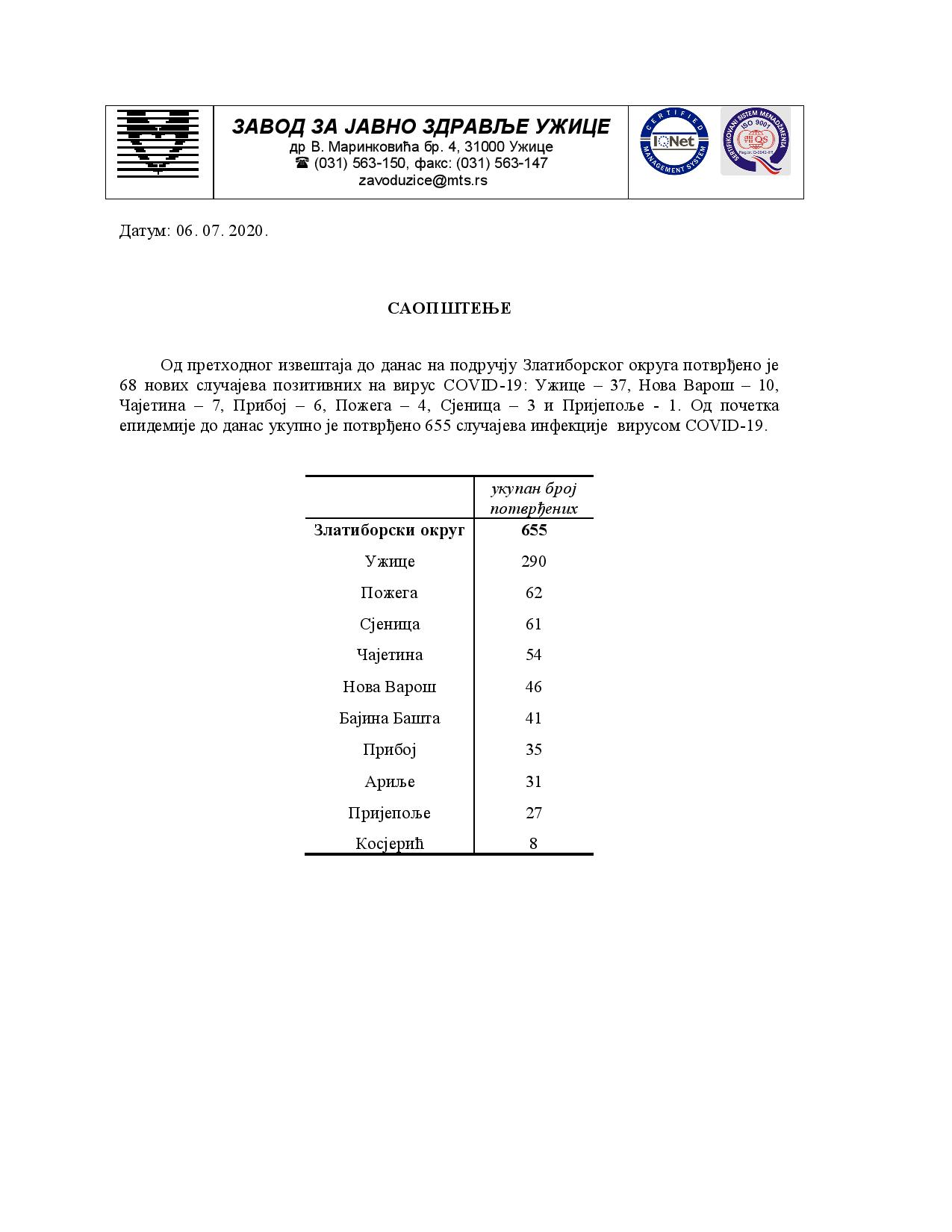 68 нових случајева позитивних на вирус COVID-19: Ужице – 37, Нова Варош – 10,