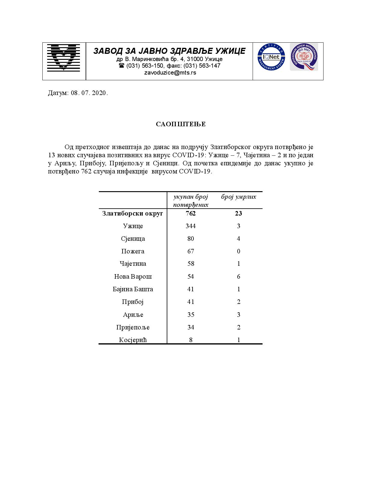 13 нових случајева позитивних на вирус COVID-19: Ужице – 7, Чајетина – 2 и по један