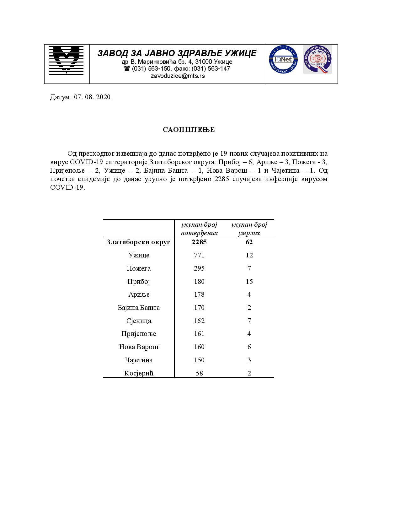 вирус COVID-19 са територије Златиборског округа: Прибој – 6, Ариље – 3, Пожега – 3,