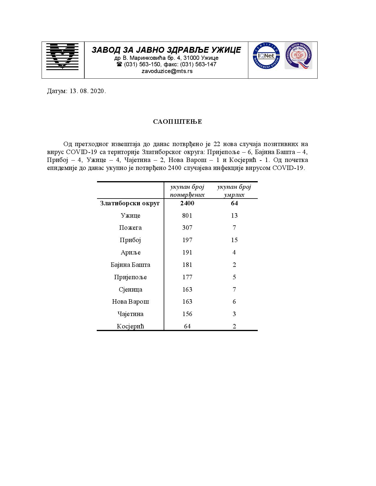 вирус COVID-19 са територије Златиборског округа: Пријепоље – 6, Бајина Башта – 4,