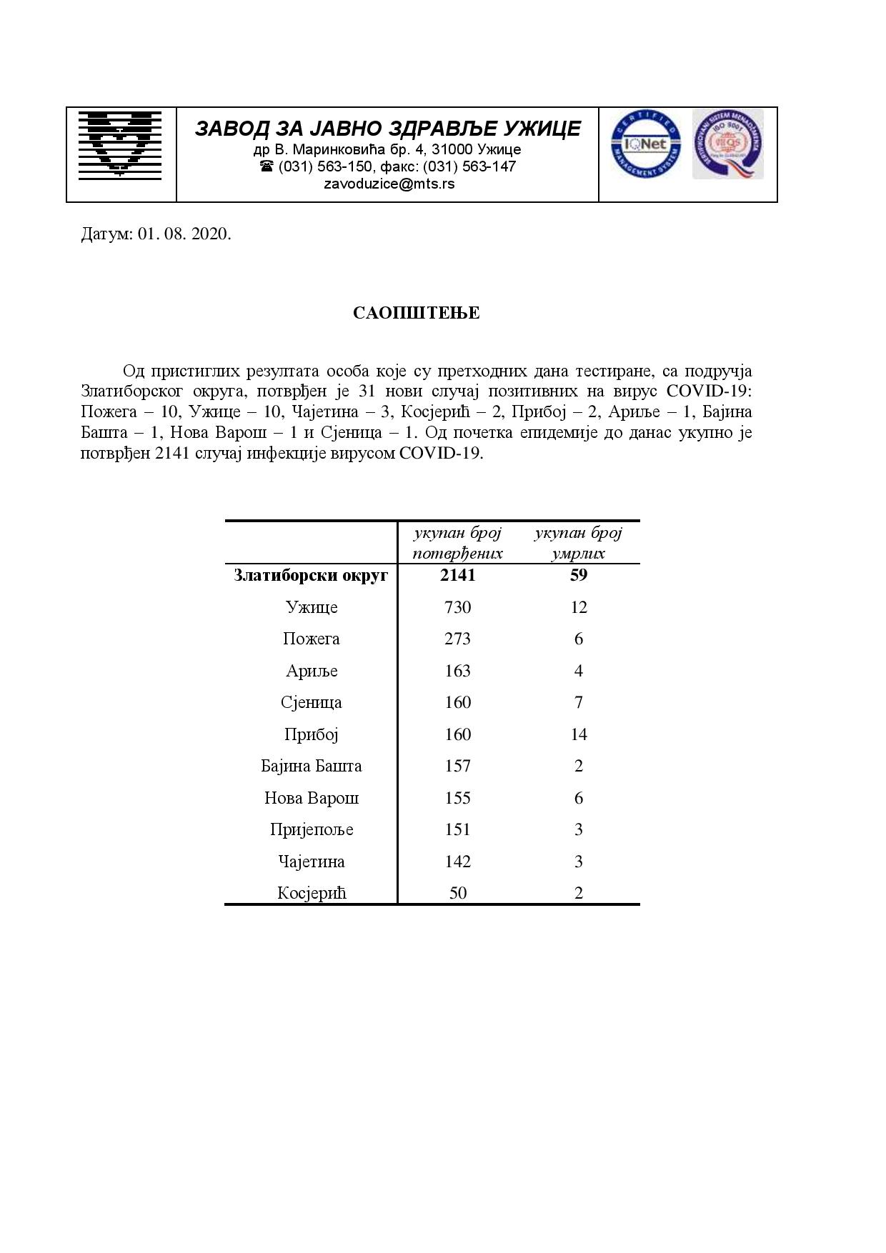 Златиборског округа, потврђен је 31 нови случај позитивних на вирус COVID-19: