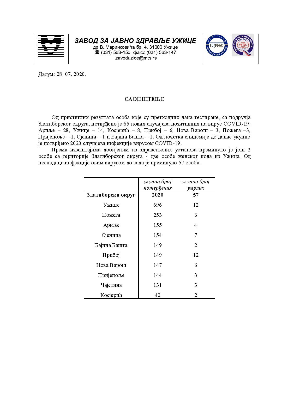 Златиборског округа, потврђено је 65 нових случајева позитивних на вирус COVID-19: