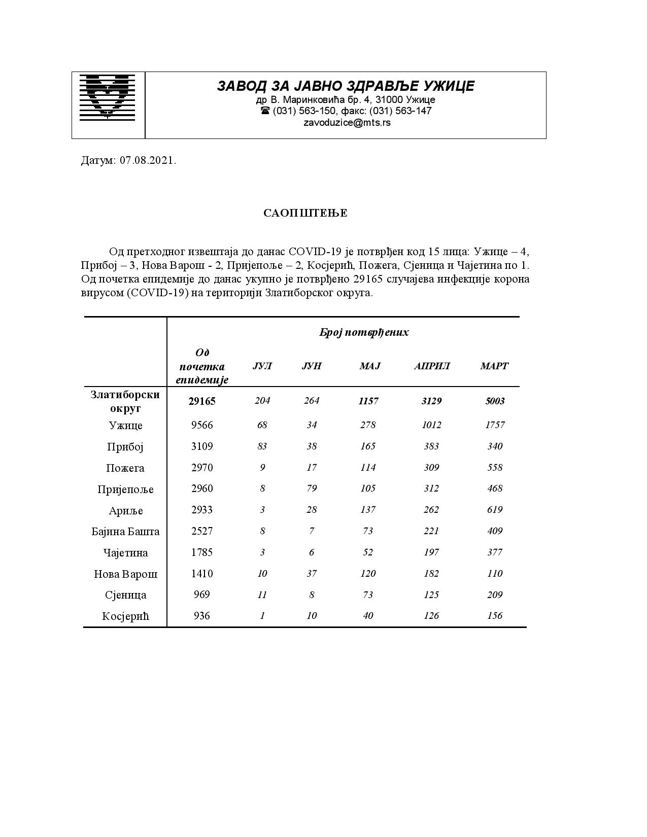 Од претходног извештаја до данас COVID-19 је потврђен код 15 лица: Ужице – 4,